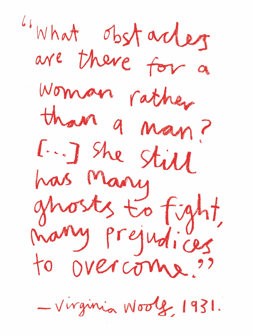 ‘Even when the path is nominally open – when there is nothing to prevent a woman from being a doctor, a lawyer, a civil servant – there are many phantoms and obstacles, as I believe, looming in her way. To discuss and define them is I think of great value and importance; for thus only can the labour be shared, the difficulties be solved.’ (Woolf, 1931:8)