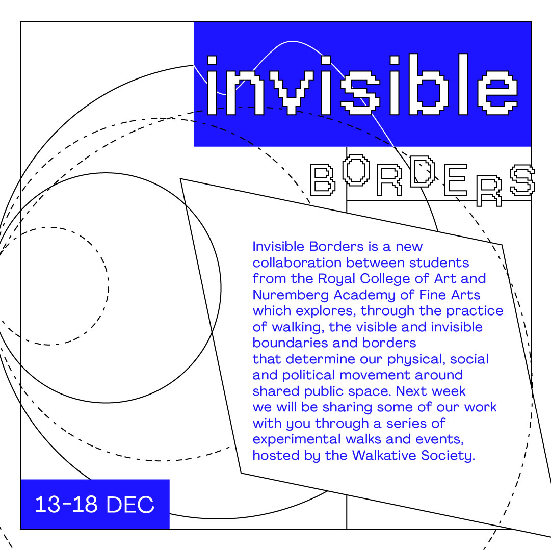 Invisible Borders is a new collaboration between students from the Royal College of Art and Nuremberg Academy of Fine Arts which explores, through the practice of walking, the visible and invisible boundaries and borders that determine our physical, social and political movement around shared public space. Next week we will be sharing some of our work with you through a series of experimental walks and events, hosted by the Walkative Society.