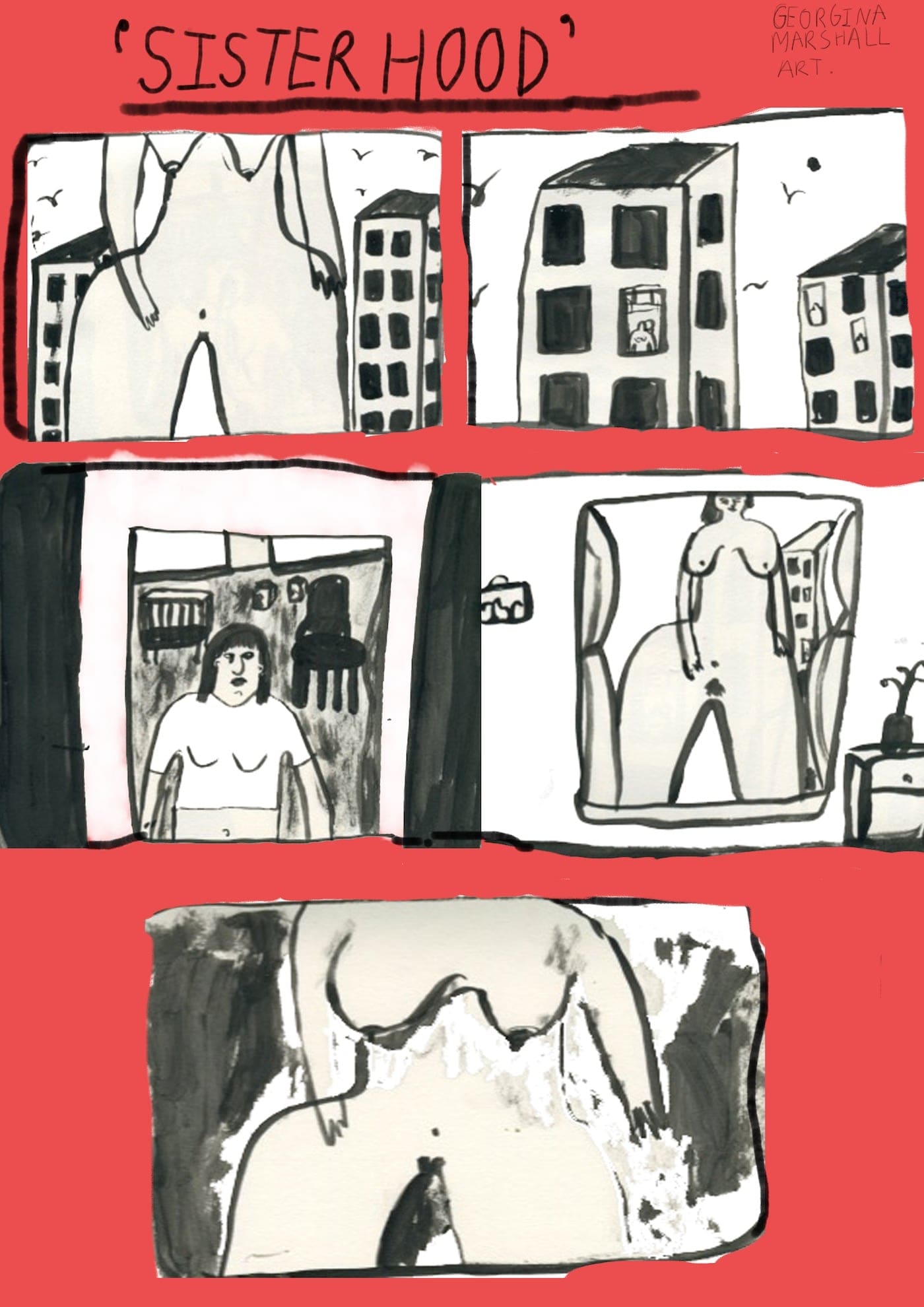 Inspired by the hierarchy of feminism past and present. I have created a 5 image comic strip to explore the ideology of ‘Sisterhood’. The idea of Sisterhood was sometimes mis-used for power and equity. As feminists we are all equal and must represent and include all female, male, non-binary and gender fluid people in order to create equality amongst feminists.
