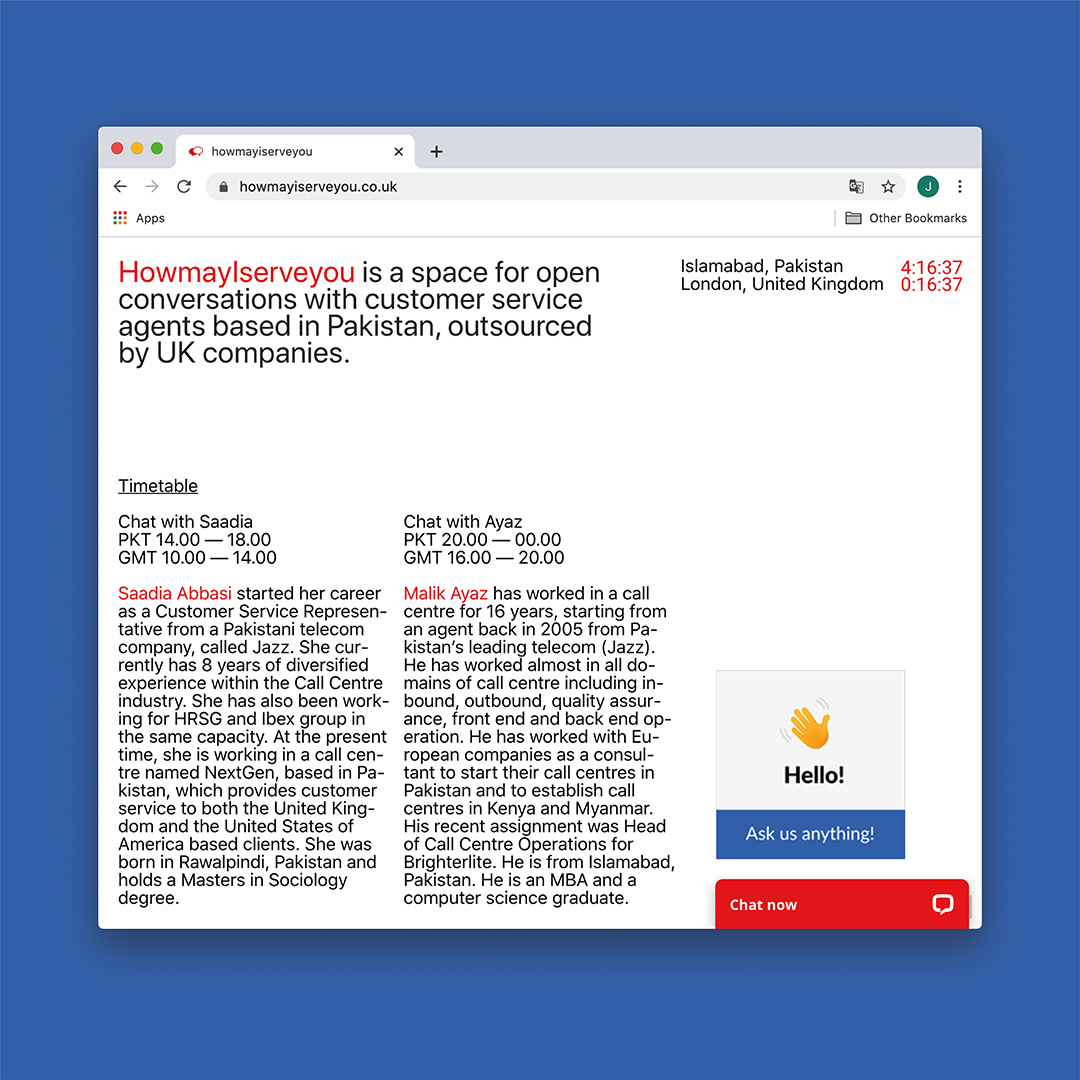 Globalisation, connectivity, online interactions and invisibility are some of the features to describe Call centres/Live-chat/Hotline. This service can be helpful within the online facilities. The problem is when they are outsourced – low-cost exported service (sweatshops or in this online context: dryeyes) in different countries. Even more problematic when these countries were colonised by the country requesting this service (India/Pakistan). It again shows the parallel between costumer/service – coloniser/colonised. This event is going to be host in an open platform where you can have open conversations via live chat with two customer service agents based in Pakistan, outsourced by UK companies.
