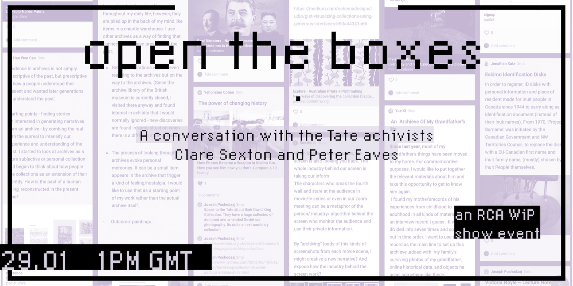 Open the Boxes will invite two Tate Archivists, Clare Sexton and Peter Eaves, to join students interrogating the archiving process in their practice. The group will open archive boxes, and open then the conversation. The boxes will be physical embodiments of one’s journey as archivist. This ritual mechanism will trigger lines of inquiry, engaging a conversation challenging our different approaches, questions and responses, according to one’s own archiving methodology and reflexion. The participants will exchange ideas, references, procedures, items and found material in order to expand the dialogue around the archiving process.