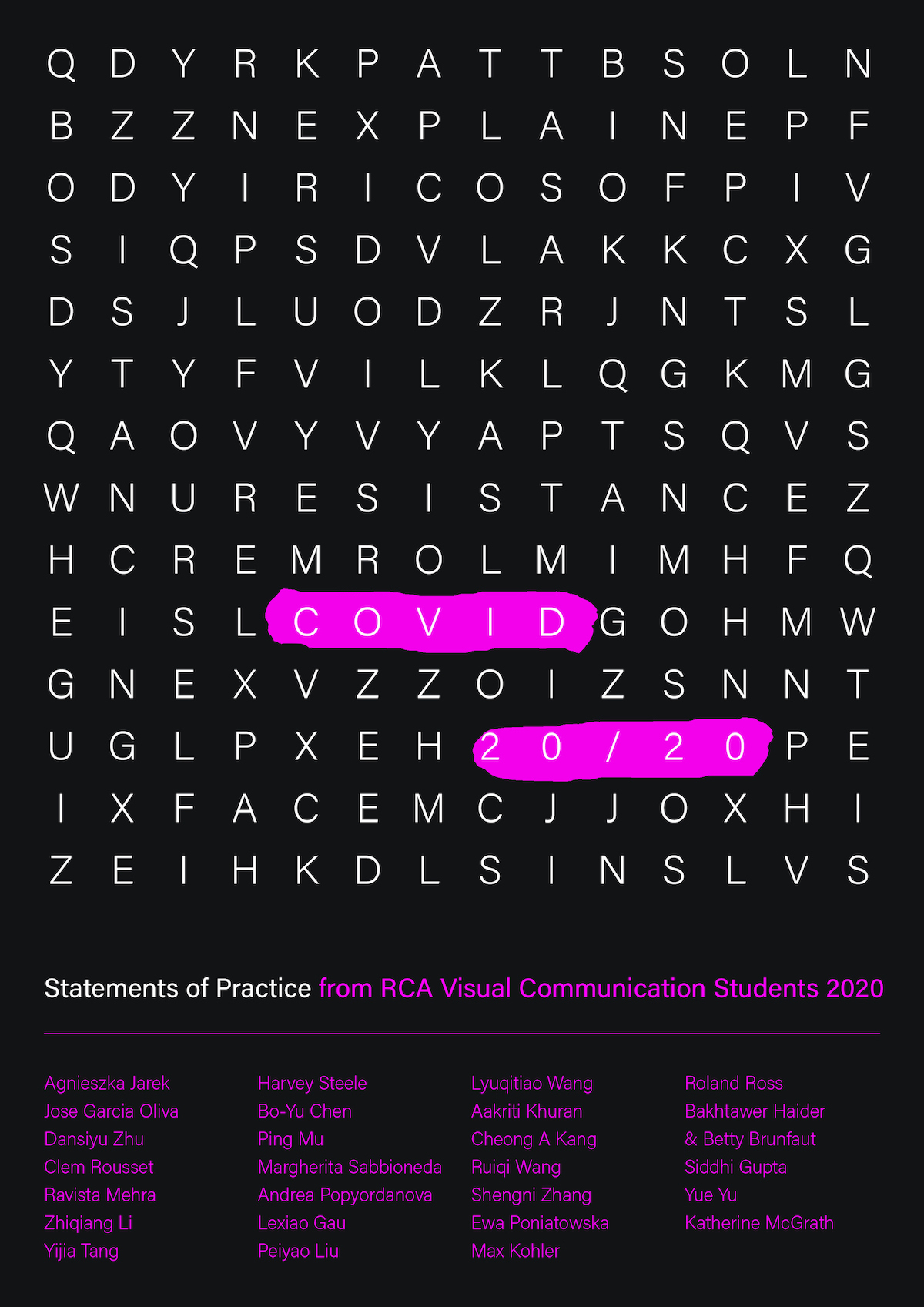 Edited by Ken Hollings and Sheena Calvert with design by Rocco Punghellini, Covid 20/20 is the outcome of the ‘Explain Yourself’ writing workshops in which Year 2 Visual Communication students are encouraged to compose short statements that define some key aspect of their individual practices. This year’s collective responses offer a subtle and complex portrait of a strange and disturbing time. Enjoy.