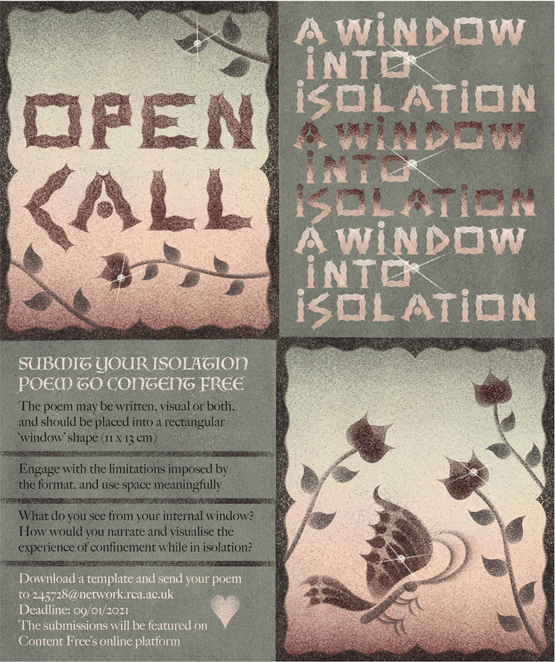 In this online collection of poems, we want to highlight all the amazing writing you might have been producing while being confined during this year. The poems may take imaginative forms and have textual as well as visual components. They could be extracts from a diary, notes on your phone, or part of a personal project… Show us an insight on what you have created behind closed doors and get your isolation gems to be part of this window-themed publication!